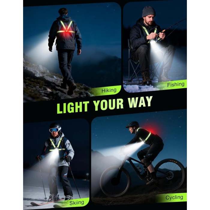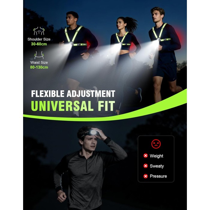 - 【Adjustable Fit & Dual-Strap Design】Unlike most single-strap options, our dual straps provide enhanced stability and adjustable fit. The waist straps of the night running gear are adjustable within a range of 31-51'' (80-130cm), while the shoulder straps can be freely adjusted between 12-24'' (30-60cm), ensuring a perfect fit and comfortable experience for all body types. Free from the discomfort of traditional headlamps, it ensures comfortable, stress-free wear no matter how long you use it.