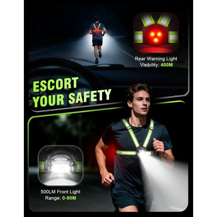 - 【500LM Powerful Illumination & 360° High Visibility】 Equipped with 2 powerful 500LM LED beads, Niweya running lights for runners provide exceptional visibility by illuminating your path up to 90 meters ahead. Combined with a 400-meter visible rear warning light and all-around reflective straps, it ensures 360° high visibility for your safety in low-light conditions.